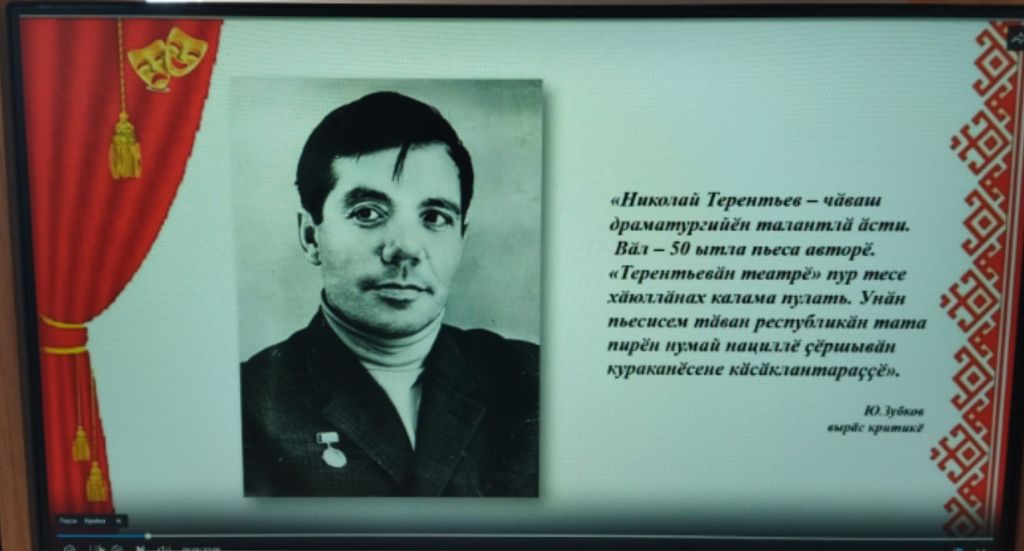 В Сойгинской сельской библиотеке состоялась беседа «Халӑхшӑн хӗмленнӗ талант», посвященная 100 летию со дня рождения писателя, драматурга, переводчика, заслуженного работника культуры РСФСР, заслуженного деятеля искусств Чувашской АССР, народного писателя Чувашии, лауреата Государственной премии Чувашской АССР им. К. В. Иванова, премии им. П. Н. Осипова Союза профессиональных писателей Чувашии Николая Терентьевича Терентьева. Н. Т.Терентьев родился 17 апреля 1925 года в д. Кошноруй Канашского района. Закончил среднюю школу и Чувашский государственный педагогический институт им. И. Я. Яковлева, затем - аспирантуру при этом же институте и Высшие литературные курсы при Литературном институте им. А. М. Горького СП СССР. Писатель долгие годы работал актером и заведующим литературной частью Чувашского государственного академического драматического театра им. К. В. Иванова. На сцене этого театра Г. Терентьевым сыграны многие роли: роль Кузьмы - “Чуна кивзен илеймeн” В. Распутина, Хĕветĕра - “Кай, кай Ивана” Н. Айзмана, Элентея - “Хура зăкaр” Н. Ильбека, Сетнера - “Нарспи” К. Иванова, Платона - “Земье чысĕ“ А. Коломиеца, и др. За 45 лет творческой деятельности им написано более 40 пьес. В разных театрах его пьесы поставлены и изданы на более чем 15 языках. Спектакли по пьесам Николая Терентьева шли на сценах театров г. Чебоксары, Ижевск, Йошкар-Ола и в других городах. Чувашский драматург перевел на чувашский язык произведения А.Островского, А.Арбузова, А.Софронова и др. Библиотекарь Светлана Петровна провела перед читателями обзор книг, ознакомила их с литературой которые были в фонде библиотеки. Это основные издания Н. Т. Терентьева: "Манӑн ҫӑлтӑр”, "Шанман чечексем”, "Пьесасем”, "Икӗ пьеса”, "Куккук заплах авӑтать”, "Суйласа илнисем”, "Суйласа илнĕ пьесасем”, "Кукушка все кукует”, "Волны бьют о берег”, а также литература, в которой рассказывается о жизни и деятельности чувашского драматурга. Завершили мероприятие просмотром презентации о жизни и творчестве писателя.